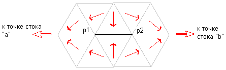Водосбор такого типа называется водосбором с многостоковой выемкой, так как вода поступает в желоб, образованный гранями p1 и p2, после чего может стекать в сток “a” или сток “b”, как показано на следующем рисунке: