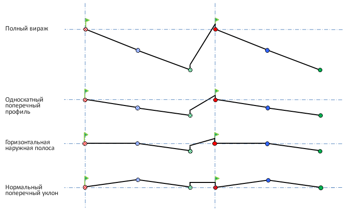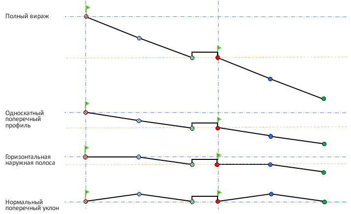 На следующей иллюстрации показан коридор типа "дорога с разделительной полосой"; поперечное сечение каждой стороны двускатное. На протяжении виража к дороге применяется операция формирования односкатного поперечного профиля:
