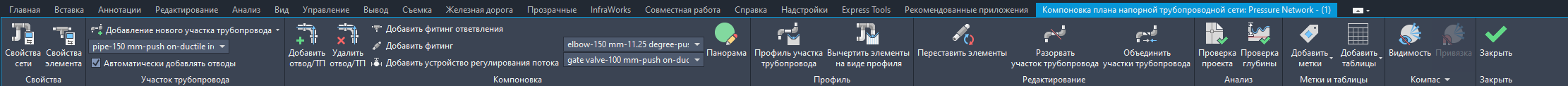 Для создания и редактирования напорной трубопроводной сети на виде в плане используется лента Компоновка плана напорной трубопроводной сети.