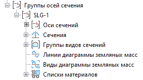 Созданные группы осей сечений отображаются как именованные группы осей сечений, например SLG-1, в коллекции «Группы осей сечений», которая находится в коллекции родительской трассы в дереве «Навигатор».