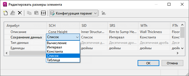 - Чтобы добавить список доступных для данного элемента размеров, следует изменить тип сохранения данных для параметра размеров, заменив его типом "Список".