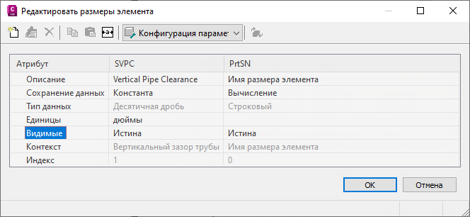 На экран будет выведено диалоговое окно "Редактировать размеры элемента", в котором будут отображены все доступные в настоящий момент параметры размеров, соответствующие выбранному элементу. В случае простого цилиндрического элемента колодца к принимаемым по умолчанию параметрам размеров относятся "Имя размера элемента (PrtSN)" и "Вертикальный зазор трубы колодца (SVPC)".