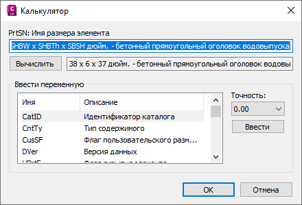 Отобразятся строки вычислений, соответствующие значениям параметров. Например, формула для вычисления "Имени размера элемента (PrtSN)" для какого-либо колодца может иметь вид "Бетонный прямоугольный оголовок водовыпуска SHBW x SHBTh x SBSH дюймов". Или, в случае трубы, формула может быть такой: FormatNumber ($Внутренний диаметр трубы,0) + "дюймовая бетонная труба".