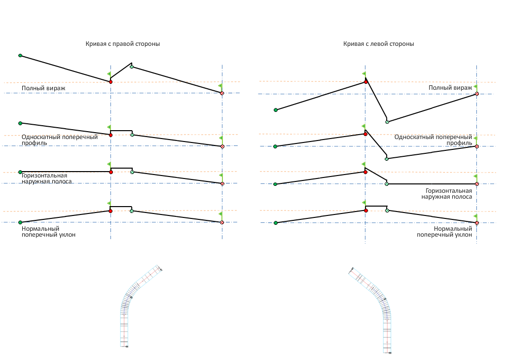 На следующей иллюстрации описан метод точки вращения с правой стороны для односкатных дорог с разделительной полосой.