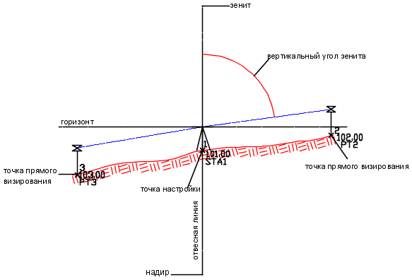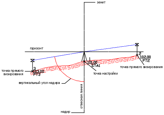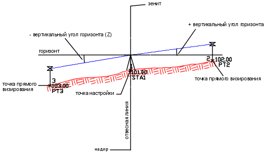 Угол выше или ниже горизонтальной плоскости. Угол выражается в ГГММСС от заданного горизонта. Вертикальные углы, отображающие уклон вниз от приборного пикета, выражаются отрицательными значениями. Зенитные углы отличаются от вертикальных углов только тем, что имеют вертикальную плоскость отсчета.