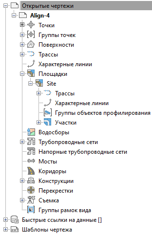 На следующей иллюстрации приведено развернутое дерево вкладки "Навигатор" для чертежа: