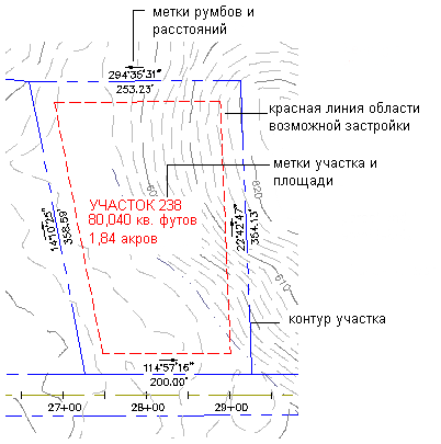 Каждый участок имеет метку площади, которая относится к участку в целом. Для выбора участка можно нажать кнопку мыши на метке площади. Кроме того, участок может иметь метки сегментов, а также ассоциированные таблицы, отображающие сведения об участке. Метки могут содержать поля пользовательских свойств.
