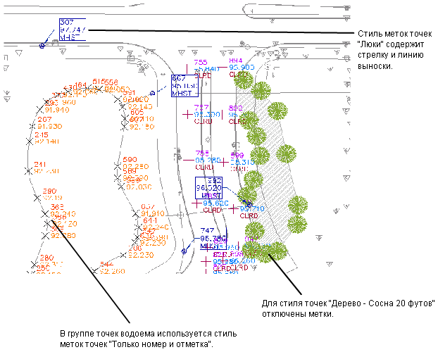Точки нумеруются и именуются уникальным образом. У каждой точки есть свойства, которые могут включать в себя такую информацию, как северное положение, восточное положение, отметка и описание. Отображаемые на чертеже точки могут иметь дополнительные свойства, например такие как стиль точки, стиль метки точки и слой; эти свойства определяют внешний вид точки.