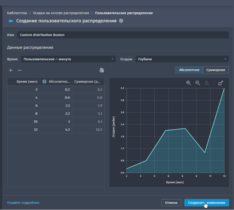 - Пользовательское — минута: минимум две записи, общая продолжительность кривой будет рассматриваться как продолжительность любого события выпадения осадков с использованием этого распределения.