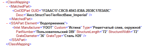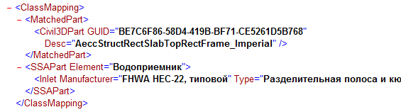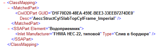 <ClassMapping> <MatchedPart> <Civil3DPart GUID = "260FBCAD-7BFC-4DC4-AD9C-84D552C799F5" Desc = "InltCurb1"/> </MatchedPart> <SSAPart Element = "Inlet"> <Inlet Manufacturer = "FDOT" PartNumber = "Curb Inlet - Type 1"/> </SSAPart> </ClassMapping>