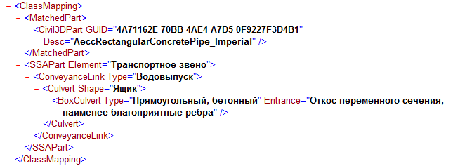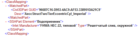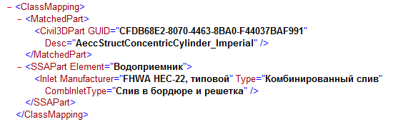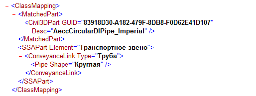<ClassMapping> <MatchedPart> <Civil3DPart GUID="30921980-2D9B-493A-88C5-6D10AEA8B835" Desc="AeccCircularConcretePipe_Imperial"/> </MatchedPart> <SSAPart Element="ConveyanceLink"> <ConveyanceLink Type="Pipe"> <Pipe Shape="Circular"/> </SSAPart> </ClassMapping>