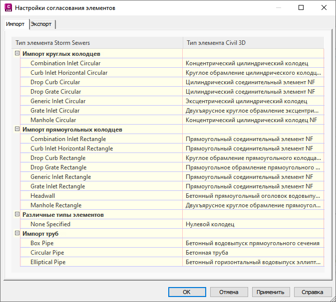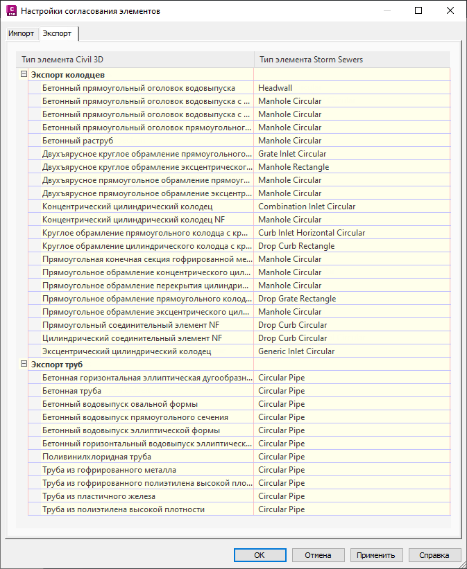 В AutoCAD Civil 3D 2011 и более ранних версиях в файл STM экспортировались только типы элементов Hydraflow Storm Sewers. Сюда относятся три типа линий (формы труб) и девять типов соединений (для колодцев), которые настраиваются в окне "Значения переноса в Storm Sewers по умолчанию"/"Значения сопоставления элементов по умолчанию" в параметрах элементов трубопроводных сетей AutoCAD Civil 3D.