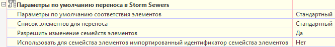 Параметры сопоставления элементов по умолчанию находятся в параметрах элементов для трубопроводных сетей в разделе "Параметры переноса в Storm Sewers по умолчанию".