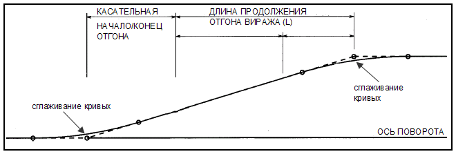Введите значение длины, большее нуля. Это значение отображается в столбце "Сглаживание кривых" в табличном редакторе. Гладкая кривая также отображается в области данных виража и на виде виража на соответствующем критическом пикете.