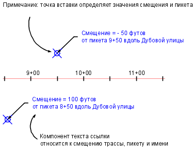 Точку вставки метки "Примечания" можно использовать для формирования данных текста ссылки, зависящих от местоположения. Например, на следующей иллюстрации точка вставки определяет значения пикета и смещения, которые отображаются в метке.