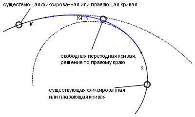 Команда создания свободной переходной кривой между двумя линиями выполняется в ситуации, когда требуется сохранение условия касательности переходных кривых к линиям, к которым она присоединены. В решении этого типа могут использоваться простые входящие или простые исходящие переходные кривые.