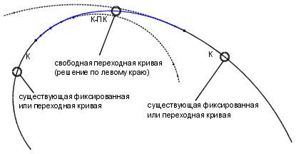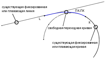 Команда добавления свободной переходной кривой между линией и кривой выполняется в ситуациях, когда при редактировании кривой, к которой присоединена переходная кривая, требуется сохранение радиуса кривой. В данном решении используются простые переходные кривые, поскольку радиус переходной кривой в конце линии бесконечен (в отличие от случая составной кривой, где радиус на каждом конце переходной кривой имеет конечную величину). Решение с линией и кривой возможно для переходных кривых всех типов, поскольку простая переходная кривая поддерживается всеми типами переходных кривых.