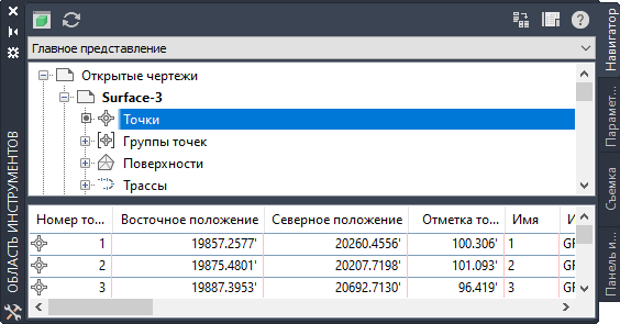 Вид списка - это таблица, которая отображается деревом окна "Область инструментов" для некоторых элементов. В некоторых случаях эту информацию можно редактировать. На следующем чертеже показано, как в дереве навигатора выглядит представление точек в виде списка:
