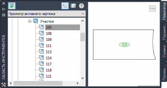 При графическом представлении выводится изображение выбранного элемента. На следующей иллюстрации показано, как в дереве навигатора выглядит графическое представление участка.
