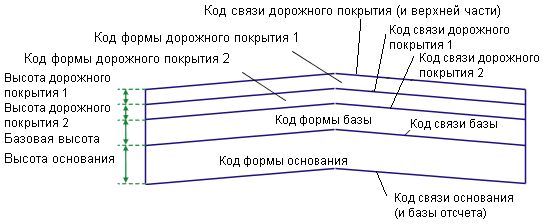 Стандартные коды звеньев в направлении от верхнего звена к нижнему следующие: "Покрытие", "Покрытие1", "Покрытие2", "Основание" и "Дополнительный слой основания". Код "Верх" также назначается всем звеньям на проектной поверхности, совмещаясь за счет этого со звеньями "Покрытие" на замощенных участках. Кроме того, нижней поверхности дополнительного слоя основания назначается код "База отсчета". Коды фигур для областей материалов в направлении от верхней области к нижней следующие: "Покрытие1", "Покрытие2", "Основание" и "Дополнительный слой основания".