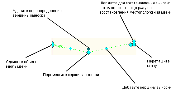 Ручки управления вершиной выноски используются для добавления, перемещения и сброса вершин выносок. Можно добавить любое количество сегментов выноски.
