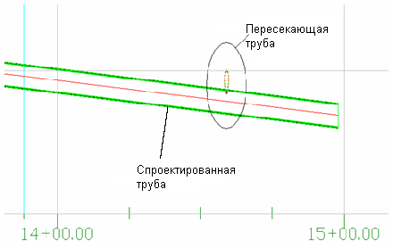 Трубы, пересекающие вид профиля или вид сечения, отображаются как пересечения труб.