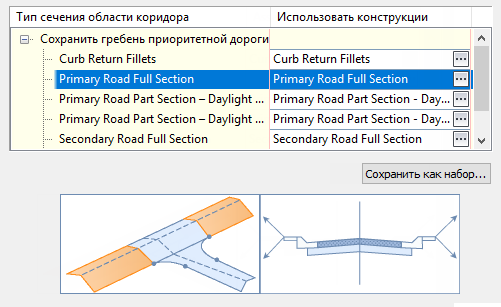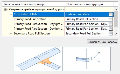 Аналогичным образом, при выборе области коридора «Сопряжения скруглений на пересечении» выводится следующее схематичное изображение.