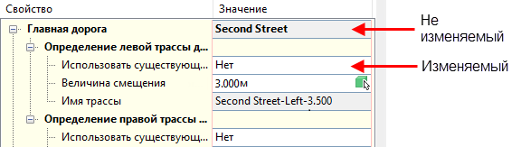 В частности, в диалоговых окнах редактирования, таких как "Перекресток - Параметры смещения" и "Перекресток - Параметры сопряжений на пересечении", применяются следующие функции.