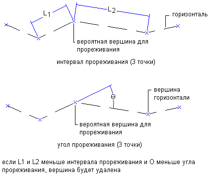 Прореживание заключается в уменьшении количества точек, генерируемых на горизонталях. При применении условий прореживания вершины пропускаются в том случае, если расстояние и угол отклонения между ними меньше соответствующих пороговых значений. Чем больше пороговые значения расстояния и угла, тем больше количество удаляемых точек. Пороговое значение расстояния задается в единицах измерения длины, а пороговое значение угла - в единицах измерения углов. Пороговые значения для прореживания должны быть меньше пороговых значений для пополнения.