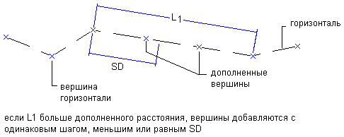 Пороговое значение расстояния для пополнения определяет максимальное расстояние между вершинами. Если расстояние между вершинами на горизонтали больше порогового значения для пополнения, на горизонтали добавляются точки с постоянным интервалом, не превышающим порогового значения расстояния. Чем меньше пороговое значение для расстояния, тем больше количество добавляемых точек.