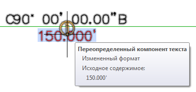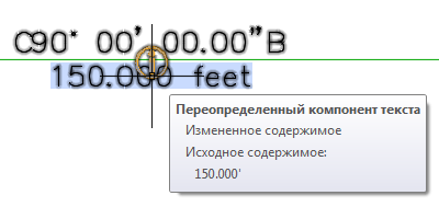 Измененное содержимое. Указывает на то, что содержимое метки было изменено или ее содержимое и формат были изменены. На следующем рисунке символ фута (') был изменен на символ футов.