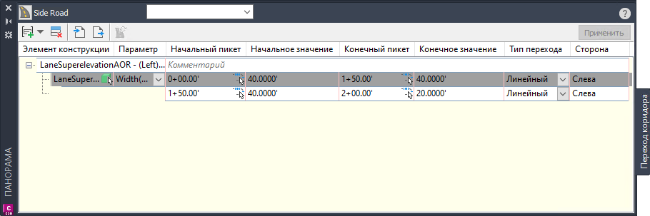 Значения можно также задать в панорамном виде «Переход коридора».