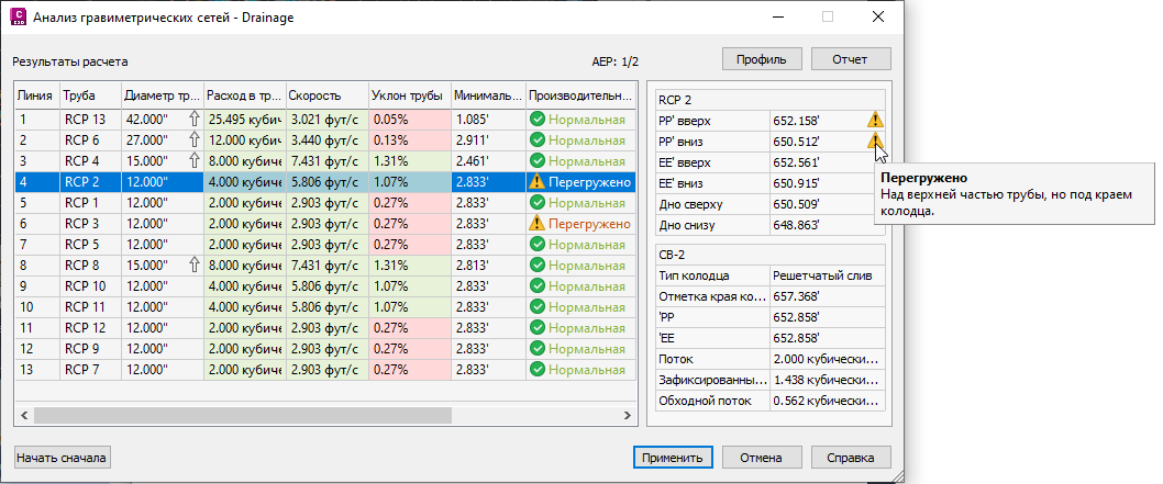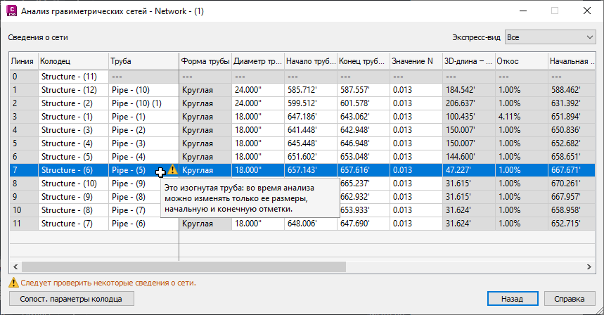 При выборе строки в таблице результатов на панели справа отображаются подробные сведения о трубах и колодцах в выбранной линии.