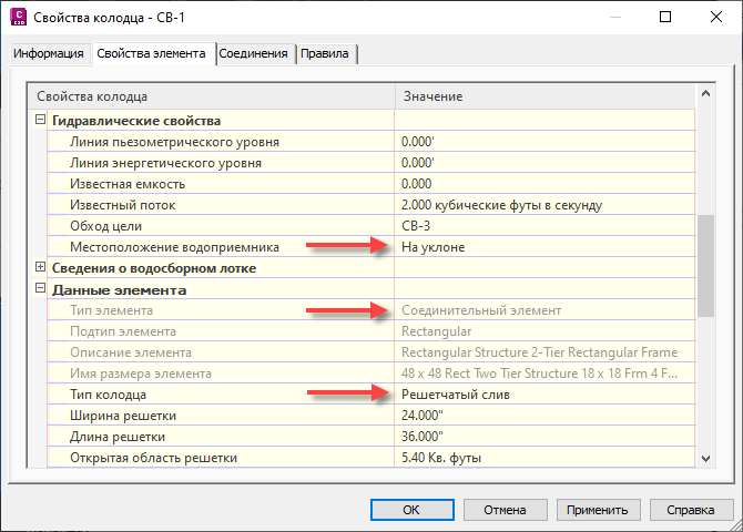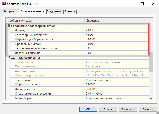 Можно использовать раздел «Сведения о водосборном лотке» в диалоговом окне «Свойства колодца» для определения свойств дорожного полотна вокруг водоприемника. Они используются командой «Анализ гравиметрических сетей» для расчета водоприемников.