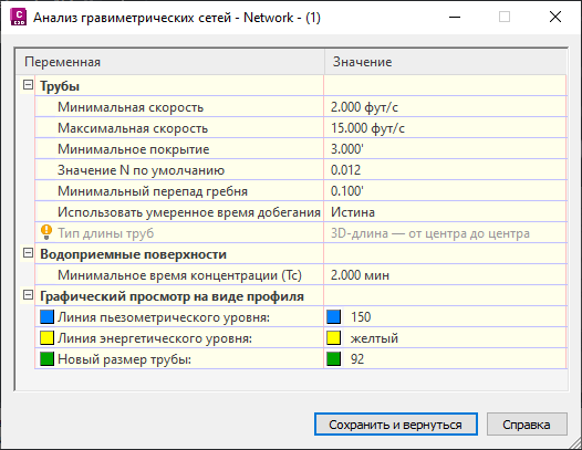 С помощью команды «Анализ гравиметрических сетей» можно изменить размеры труб, сбросить отметки дна и рассчитать пьезометрические и энергетические линии согласно стандартам HEC-22.
