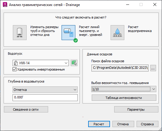 Можно выбрать из трех типов анализа: Изменить размеры труб и сбросить отметки дна, Расчет линий пьезометрического и энергетического уровней и Расчет водоприемника.