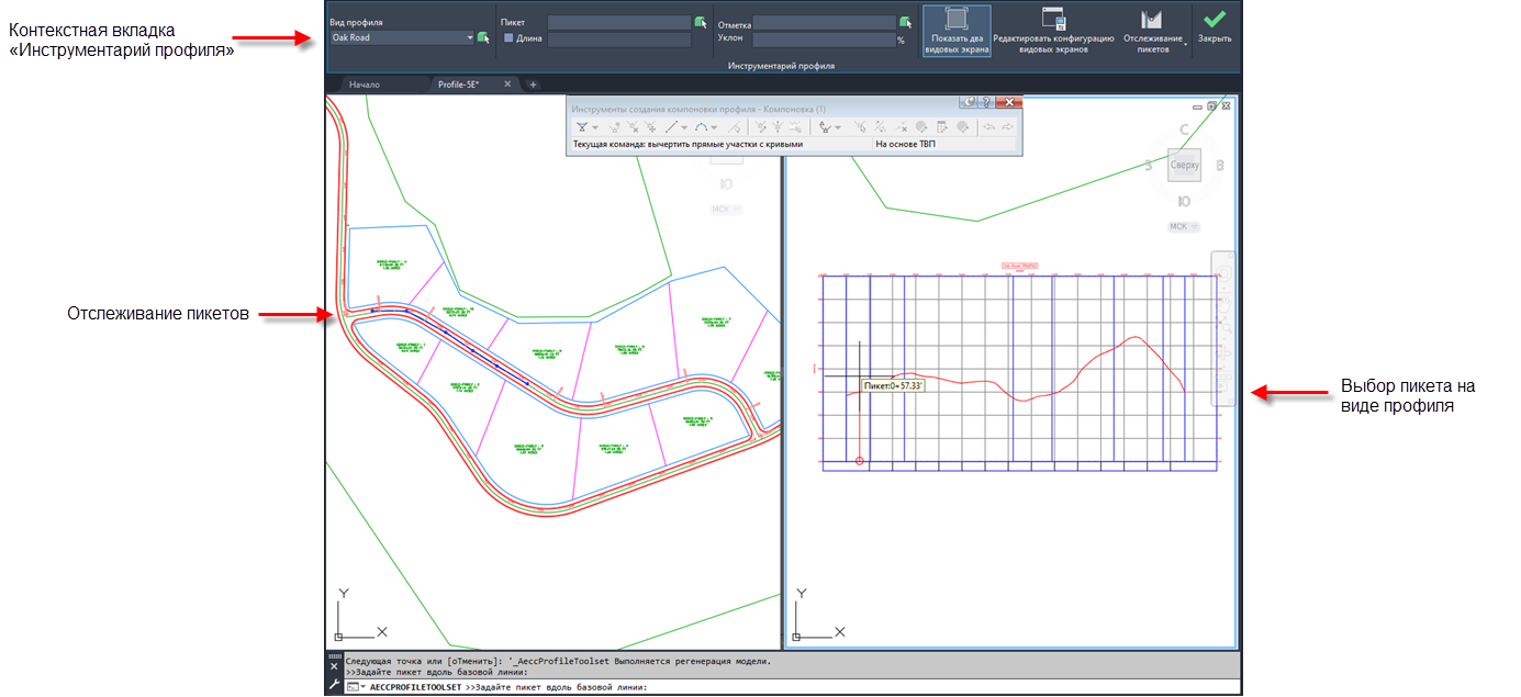 На следующем рисунке показана контекстная вкладка «Инструментарий профиля», запущенная в процессе создания профиля компоновки. При нажатии кнопки «Инструментарий профиля» на ленте «Прозрачные» открывается вкладка «Инструментарий профиля», а видовые экраны чертежа настраиваются таким образом, чтобы отображались вид в плане и вид профиля.