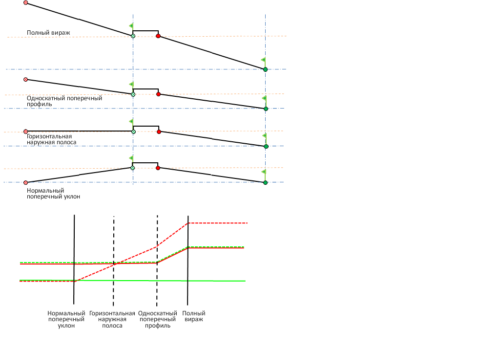 На следующей иллюстрации описан метод точки вращения во внутренней области кривой для односкатных дорог с разделительной полосой.