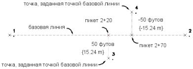 Точка 3 смещена на расстояние 15,24 вправо от базовой линии на пикете 2+20, а точка 4 смещена на расстояние 15,24 влево от базовой линии на пикете 2+70. Расстояния измеряются в текущих единицах, если не вводится определяющий суффикс.