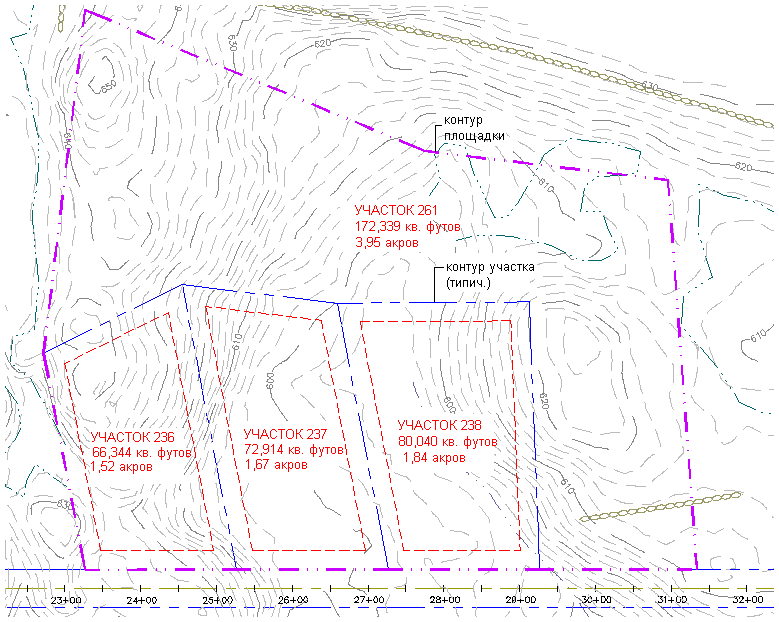 Участок площадки имеет метку площади, которую можно сделать видимой или скрыть. Цвет и тип линии границы участка площадки можно изменять, как и порядок вычерчивания ее по сравнению с границами участков, которые она охватывает.