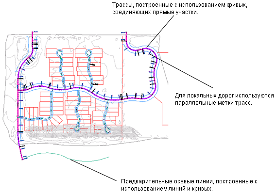 Объекты трассы могут представлять осевые линии дороги, трубопроводные сети и другие базовые линии построений. Создание и определение трассы в плане представляет собой один из первых шагов в конструировании дорожного полотна, железной дороги или площадки. Можно нарисовать геометрию трассы в виде полилинии, а затем создать на основе этой геометрии именованную трассу. Более точная настройка возможна при создании объекта-трассы с помощью инструментов компоновки трассы. Изменения в трассы можно вносить при помощи ручек или команд панели "Инструменты компоновки трассы", причем касание между компонентами трасс поддерживается автоматически.