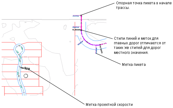 Управление внешним видом компонентов трассы и меток осуществляется при помощи стилей. Можно создавать различные стили для использования на различных фазах проекта. При создании трассы задается стиль объекта трассы и стили меток трассы. Диалоговое окно "Метки трассы" позволяет создавать группы стилей для меток трасс и сохранять эти метки в виде наборов меток для использования при работе с другими трассами.