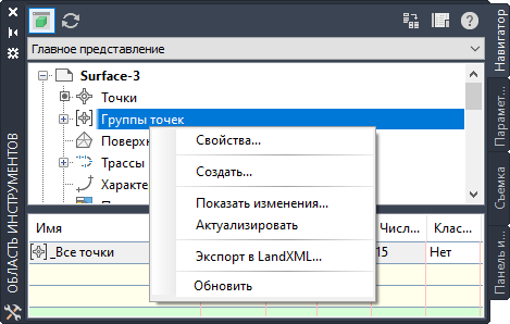 Окно "Область инструментов" является интегрированным компонентом интерфейса пользователя, из которого можно обратиться к командам, стилям и данным. Оно используется для доступа к вкладкам Навигатор, Параметры, Съемка и Панель инструментов. Для вызова команд щелкните правой кнопкой мыши на коллекции или элементе на одной из этих вкладок.