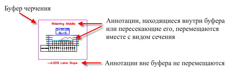 Элементы чертежа, которые добавляются в пределах границы буфера или пересекают ее, связываются с видами сечения и перемещаются вместе с ними.