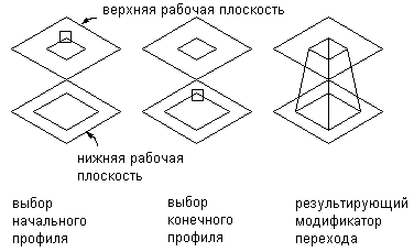 Модификатор перехода предназначен для создания между двумя профилями тела перехода. Переход содержит как начальный, так и конечный профиль, причем они не могут находиться в одной и той же рабочей плоскости. Для обеспечения выравнивания профилей между рабочими плоскостями применяются опорные точки, хотя выравнивать центры профилей нет необходимости.