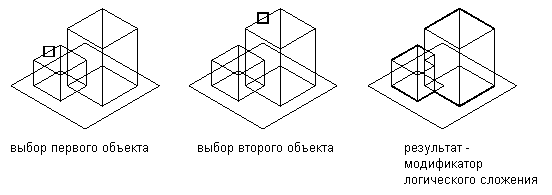 Модификатор логического добавления комбинирует два объекта для создания из них одного. Этот модификатор подразумевает применение основной концепции добавления: геометрический объект, оказавшийся при сложении внутри другого геометрического объекта, удаляется. Этот модификатор полезен при создании моделей элементов, которые размещаются в чертеже в точности в том виде, как они были созданы в модели.