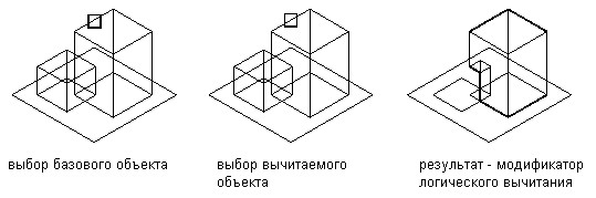 Модификатор логического вычитания выполняет операцию вычитания одного или нескольких объектов из другого объекта для создания нового. Этот модификатор использует основную формулу, которая применяется при создании конечного объекта: объекты вычитания удаляются из базового объекта. Чтобы результаты вычитания были видны в модели, объекты вычитания должны пересекаться с базовым объектом. Если объекты не пересекаются, то объекты вычитания удаляются из базового объекта при отсутствии видимого изменения модели.