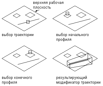 Модификатор траектории осуществляет сдвиг профиля вдоль геометрии траектории. При этом создается 3D объект на основании начального и конечного профиля части геометрии, такой как линия или дуга. Начальный и конечный профили могут различаться.