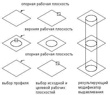 Конструктор элементов предоставляет шесть типов модификаторов: выдавливание, траектория, секущая плоскость, логическое добавление и логическое вычитание. Выдавливание представляет собой наиболее часто встречающийся тип модификатора, который используется при моделировании элементов, и в целом является для модели базовым объектом. При выдавливании профиля с целью создания объекта определяется изменение формы объекта путем выбора одной из четырех операций: "СредПлоскость", "Плоскость", "От-до" или "Глухое".