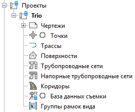 Проект содержит коллекции объектов, такие как поверхности, трассы, профили, трубопроводные сети, напорные трубопроводные сети и группы рамок вида, которые можно использовать совместно с другими пользователями. Все совместно используемые объекты проекта указываются в списке объектов проекта в дереве вкладки "Навигатор". Членам рабочей группы проекта разрешается создавать в чертеже копию объекта проекта "только для чтения", именуемую ссылкой. Копия "только для чтения" геометрии объекта проекта может быть использована для выполнения задач маркировки, проектирования, анализа или задач причинно-следственного характера.